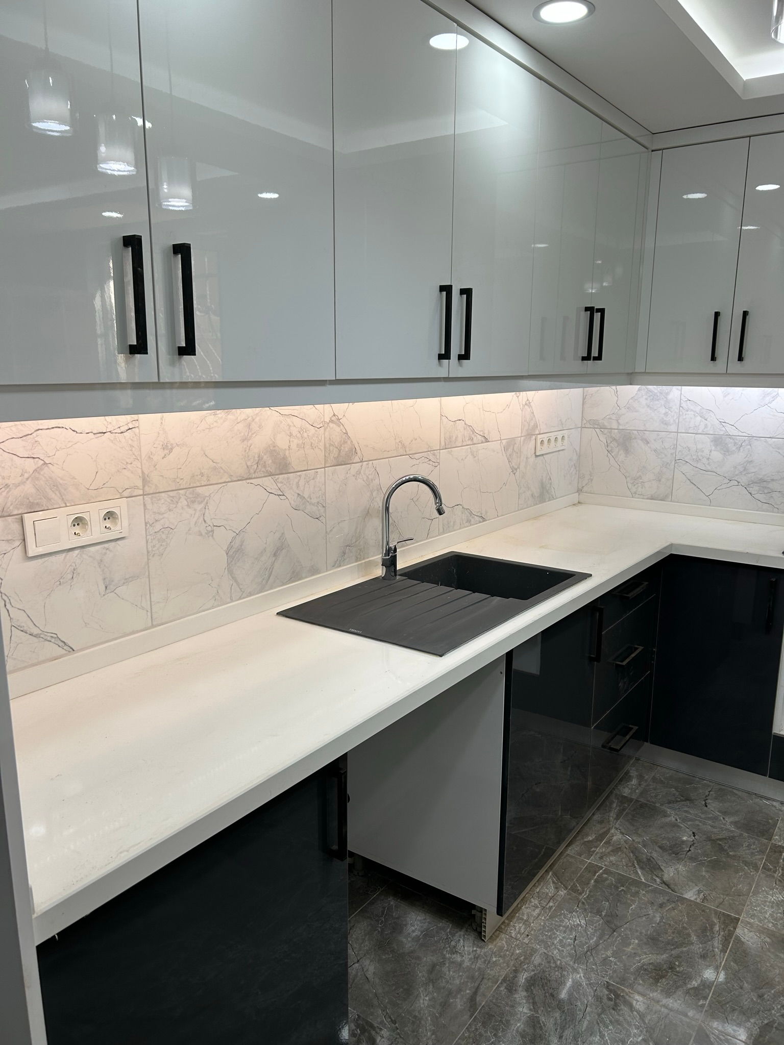 - Yeni mat lake mutfak dolapları, ankastre yerleşimi ve kuvars tezgâh
