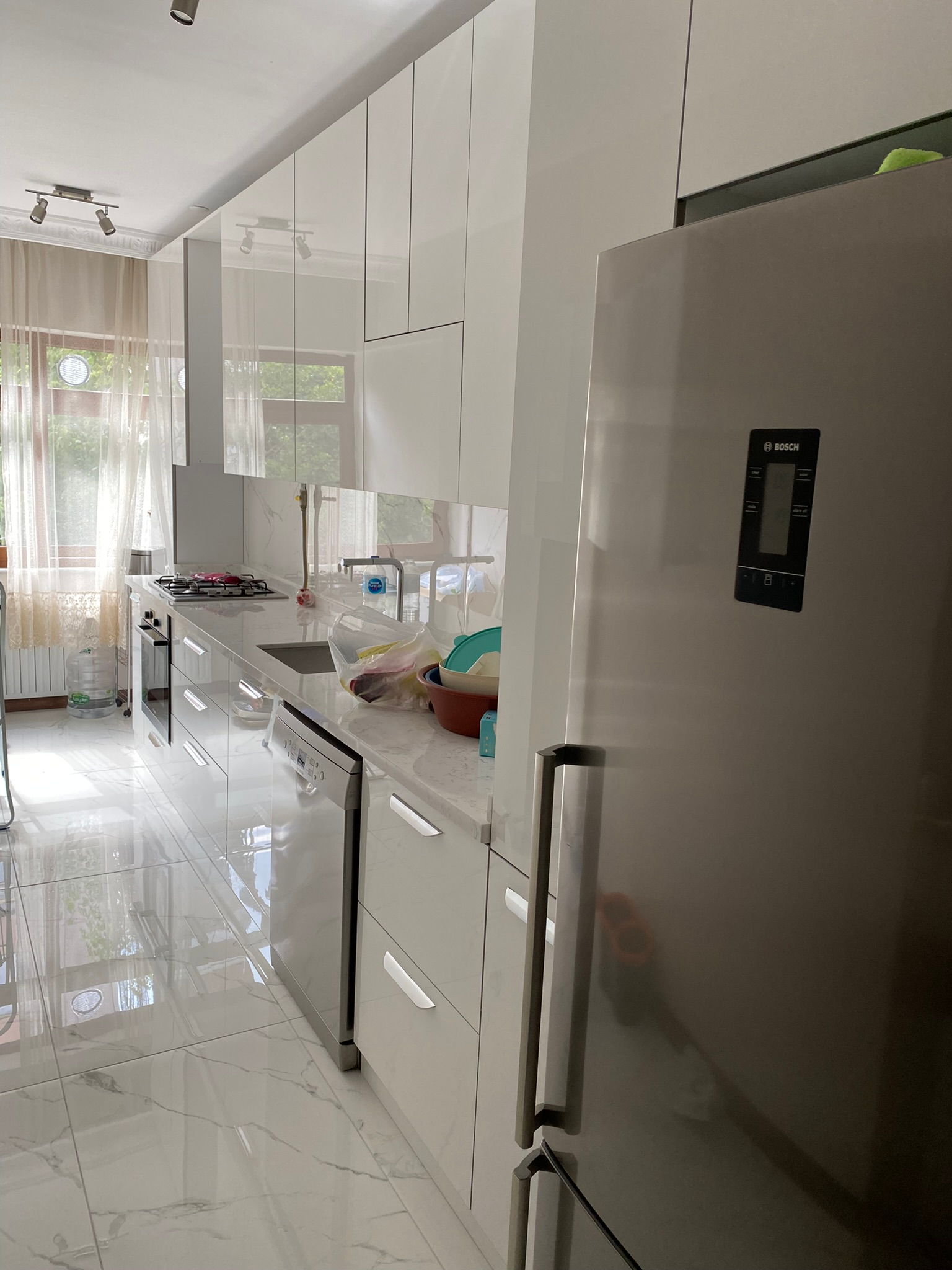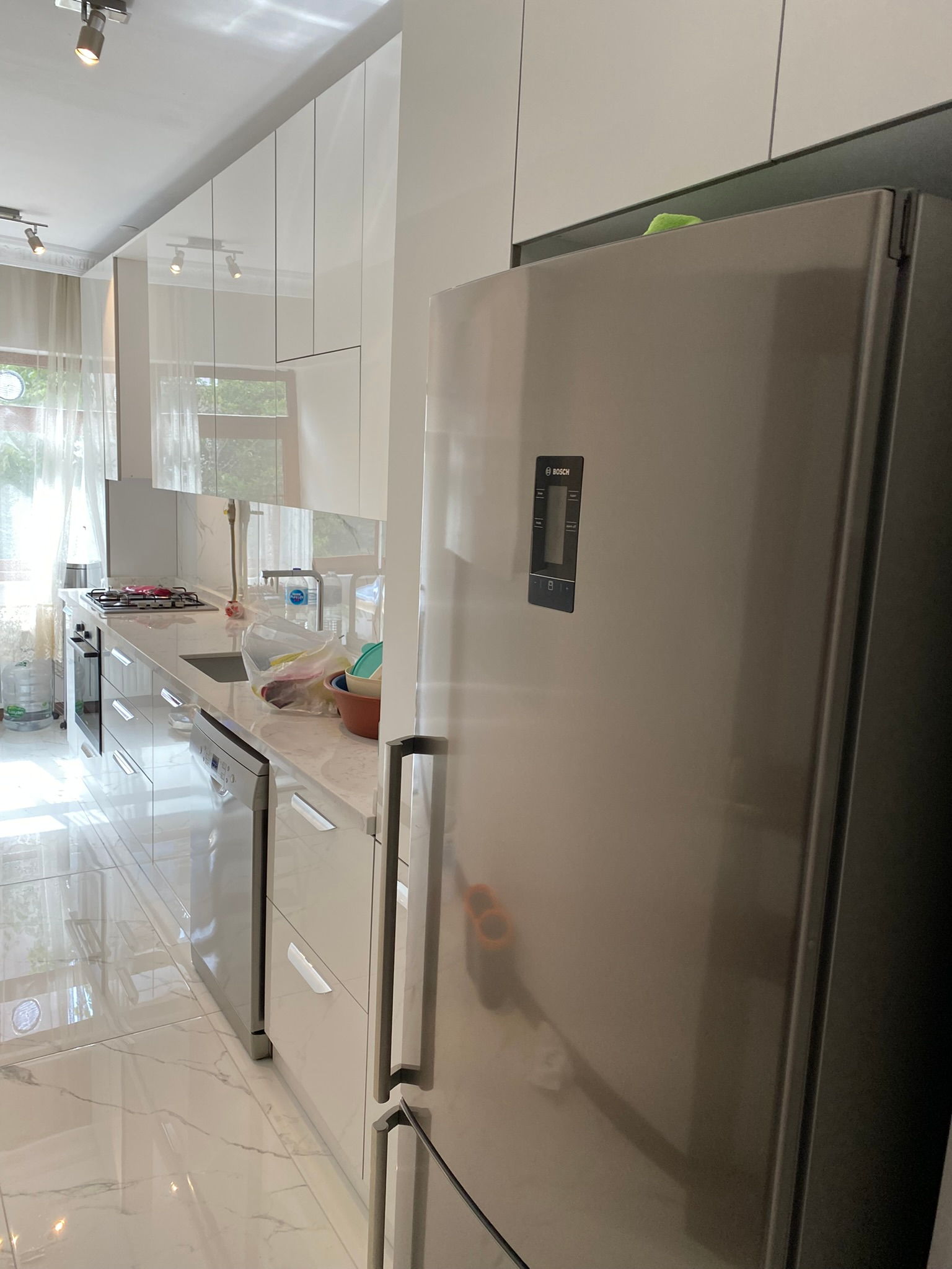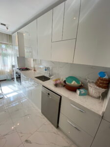 - Mutfakta yüksek dolap sistemleri, granit evye, LED aydınlatmalı tezgâh